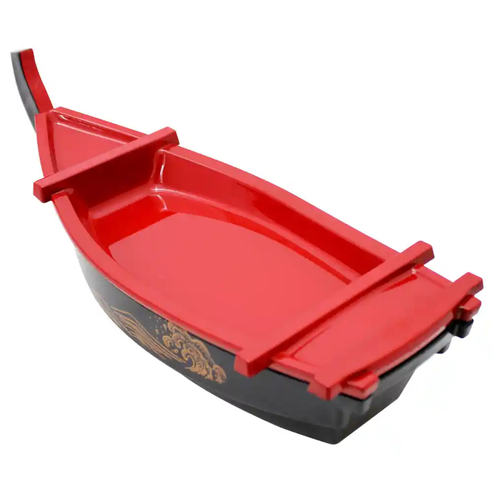 Barco para que sirvas tu sushi en un utensilio de melamina práctico y maravilloso para tus bocados. Dimensiones: 35 x 13.5 x 12 cm