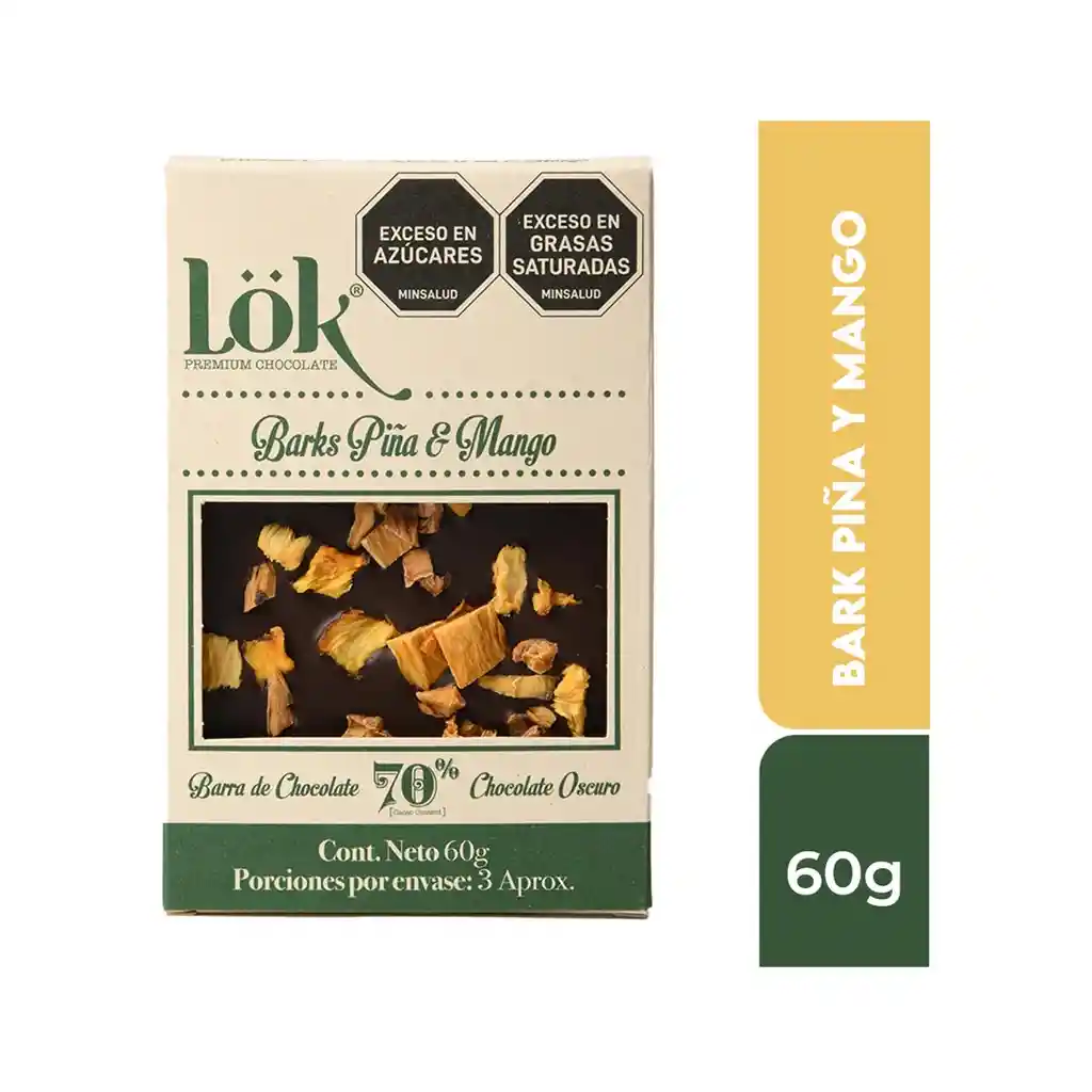 🍫 BARK 60 g LÖK Chocolate 70% Piña–Mango Chocolate premium con 70% cacao, combinado con trozos naturales de piña y mango que aportan un contraste tropical entre lo dulce y lo ácido. Su base de cacao intenso se equilibra con notas frutales frescas, logrando una experiencia exótica y sofisticada. Contenido: 60 g Perfil: Cacao intenso con toque tropical y frutal. Ideal para disfrutar como snack gourmet o acompañar café y vinos tintos jóvenes.