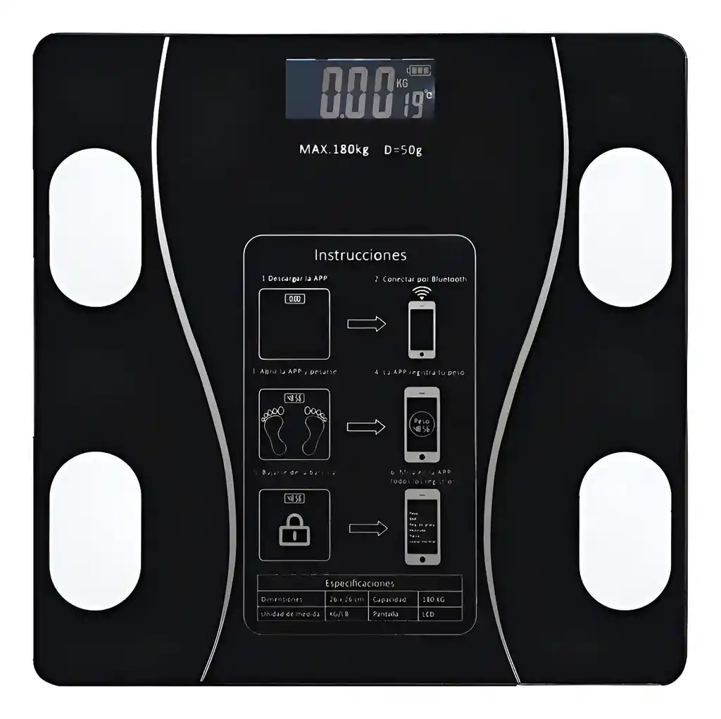 La Báscula de baño digital con Bluetooth cuenta con 15 funciones esenciales, dentro de las cuales se encuentran el monitor de peso corporal de alta precisión, índice de masa corporal, grasa visceral entre otras. Tienes un sistema de sincronización de teléfonos inteligentes. nuestra báscula bluetooth se conecta con las aplicaciones Apple Health, Google Fit y Fitbit para obtener una visión completa de la composición corporal y el bienestar físico. Realice un seguimiento y registre su progreso a lo largo del tiempo con la aplicación. Medición de alta precisión: esta báscula corporal está diseñada con 8 sensores de peso y composición altamente avanzados con una precisión de 0.22 libras. Elija entre 3 unidades de medida: lb / kg / st con un peso máximo de 400 lb / 180 kg. Pésese sin su teléfono para obtener una lectura instantánea de peso en libras / kg / t. CARACTERÍSTICAS - Sincronización con app de celular inteligente para mayor control y seguimiento. - Su medicion es posible mediante las Unidades en Kg / lb - 10 grupos de usuarios - Peso mínimo soportado: 5Kg - Peso máximo soportado: 180 Kg - Se conecta mediante Bluetooth: 2.1 para mas facilidad de uso. - Dispositivos de soporte: android 4.3 en adelante. Iphone 7 en adelante. - Apagado automático - Alerta por sobrecarga - Temperatura de trabajo: 10 a 40ºC - Potencia: 3 x pilas AAA (no incluidas) MEDIDAS Largo: 26 cm Ancho: 26 cm Alto: 2 cm Peso: 810 g QUE INCLUYE LA COMPRA X1 Bascula X1 Cable Carga
