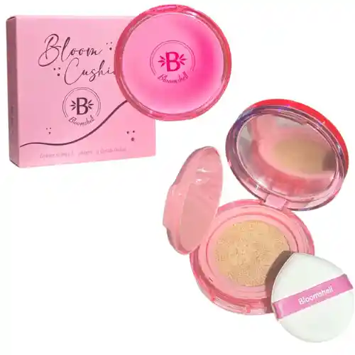 La BASE BLOOM CUSHION de Bloomshell es una base de maquillaje profesional con una innovadora fórmula coreana que combina propiedades de cuidado facial y maquillaje para lograr un acabado natural y luminoso. Características Principales -Acabado: Proporciona un acabado natural, fresco y luminoso (efecto "glow"), sin dejar sensación pesada en la piel. -Cobertura: Ofrece una cobertura modulable de media a alta, ideal para unificar el tono y disimular imperfecciones. -Ingredientes de Cuidado Facial: Su fórmula contiene un 60% de ingredientes de cuidado facial, incluyendo centella asiática y colágeno, que ayudan a nutrir, hidratar y rejuvenecer la piel. -Formato: Viene en un práctico formato de cushion (cojín) compacto con una borla aplicadora, lo que facilita una aplicación uniforme y sin exceso de producto, ideal para retoques rápidos durante el día. -Tipo de piel: Reseñas de usuarios indican que funciona bien para pieles mixtas a grasas y no es comedogénica.