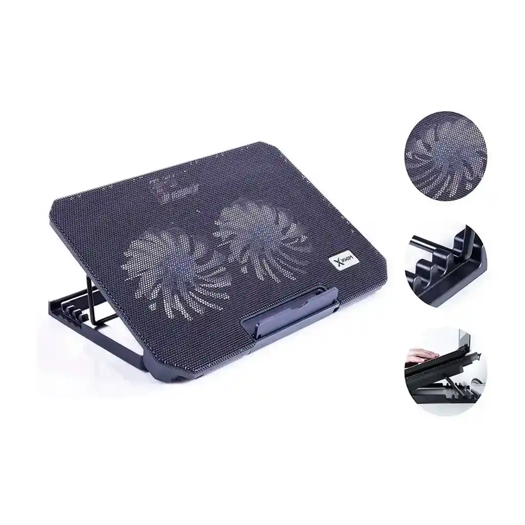 Marca y modelo: XKIM. Características principales: Cuenta con dos ventiladores para rápida disipación del calor. Conectividad: Incluye 2 puertos USB para alimentación. Ergonomía: Ofrece opción de ajuste de altura para mejorar la postura. Compatibilidad: Diseñada para portátiles de hasta 17 pulgadas.