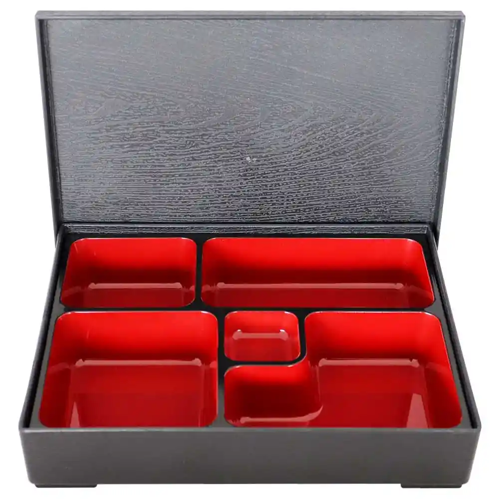 Caja tipo bento box para alimentos de 4 espacios. Medidas: 30 x 25 x 6 cm.