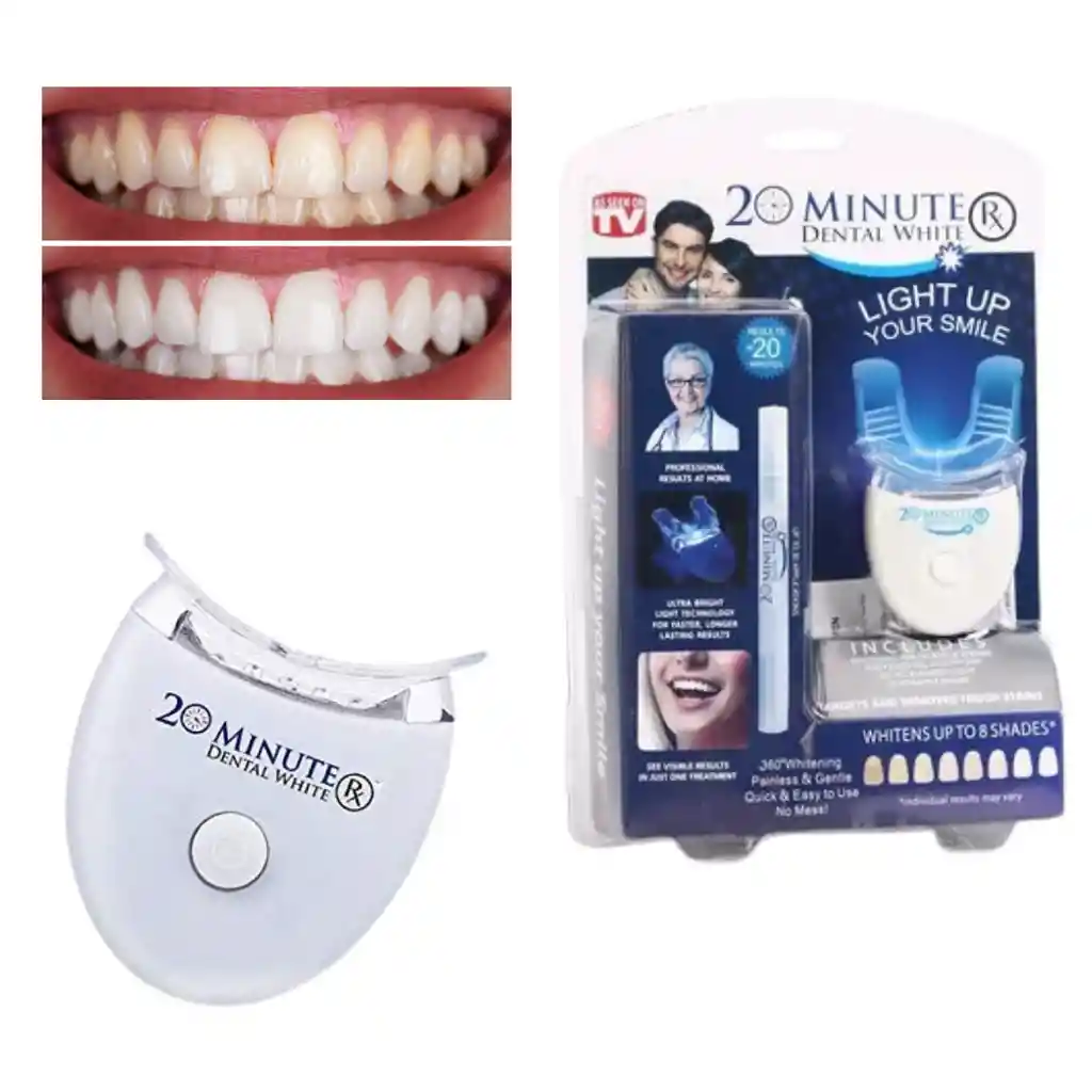 Sistema profesional de blanqueamiento dental. Blanquea hasta 8 tonos en solo 20 minutos. Incluye: hisopos con vitamina E, bandeja de gel prellenada y acelerador LED. Tecnología de oxígeno activo para eliminar manchas profundas. Fácil de usar: aplica, inserta y enciende. Perfecto para lograr una sonrisa más blanca en pocos minutos.