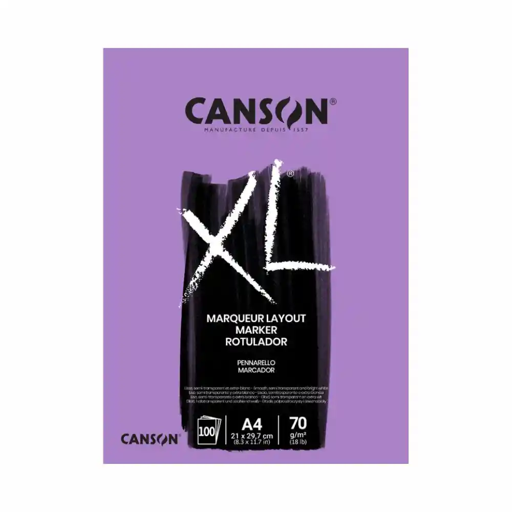 Block XL Marker (Rotulador) Papel semitransparente, muy blanco y muy liso. Resistente al agua y tiene una barrera que previene la penetración de las tintas. Ideal para todo tipo de rotuladores y marcadores (incluso a base de alcohol o disolvente). Tamaño A4 100 Hojas 70 grs