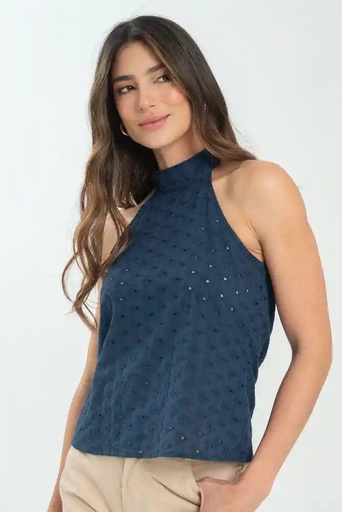 Blusa en tejido plano tipo ojalillo, cuello alto que botona en la parte trasera del cuello, con botones de pata 16L, escote de la sisa en halter, abertura y corte en centro espalda, silueta semi ajustada.