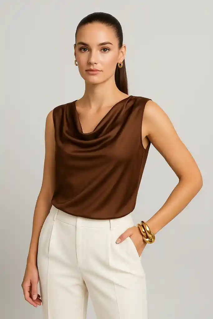 Blusa Elegante Cuello Drapeado en satin – Classic Flow Élégance ✨ Elegancia natural que se nota ✨ CON ULTRA DESCUENTO DE TEMPORADA NAVIDEÑA! Esta blusa sin mangas con cuello drapeado es la definición de sofisticación sin esfuerzo. Un diseño limpio y femenino que eleva cualquier outfit y te hace ver arreglada al instante. ¿Qué obtienes al tenerla? ✔️ Un look elegante y pulido en segundos ✔️ Caída fluida que estiliza el torso ✔️ Comodidad total sin perder presencia ✔️ Una prenda clave para looks formales y casuales Calidad que se siente Confeccionada en tela suave, ligera y de excelente caída. No marca, no aprieta y mantiene su forma. Talla única, su material se adapta cómodamente a diferentes tipos de cuerpo. Cómo usarla Ideal con pantalones de vestir, jeans o faldas. Perfecta para oficina, reuniones, cenas o eventos especiales. Agrégale accesorios y logra un look elegante sin complicarte. 🚀 Entrega rápida: 30 a 50 minutos desde que realizas tu compra. 🔥 Un básico elegante que siempre se agota rápido. 👉 Agrégala al carrito y eleva tu estilo con elegancia.