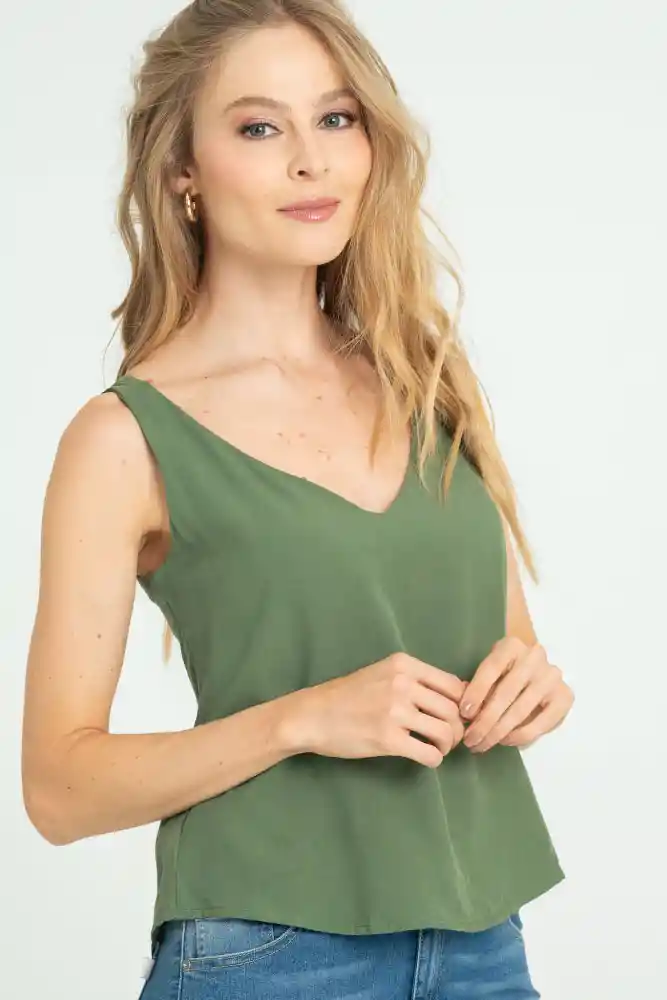 Blusa en chalis fondo entero, escote en V, manga sisa, silueta amplia.