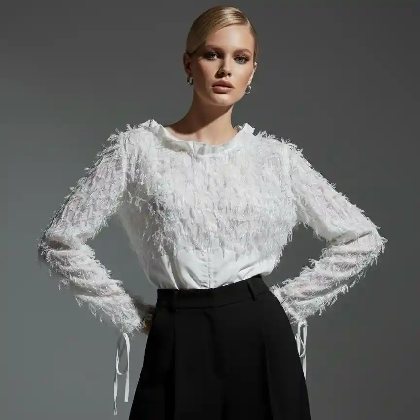 Blusa de Plumas Blancas Una blusa delicada y sofisticada que combina frescura con un toque glamuroso. Confeccionada en un diseño ligero y de manga larga, es perfecta para climas cálidos sin perder elegancia. Cuenta con la posibilidad de arremangarse a la mitad del brazo, transformando completamente el look: puedes llevarla más formal o darle un aire relajado y moderno según la ocasión. Las plumas blancas aportan movimiento, textura y un detalle distintivo que eleva cualquier outfit. Es una pieza versátil, femenina y llamativa sin perder sutileza.