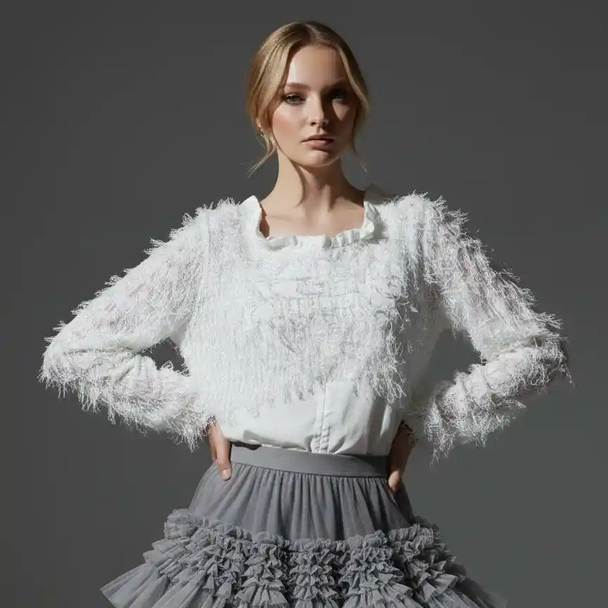 Blusa de Plumas Blancas Una blusa delicada y sofisticada que combina frescura con un toque glamuroso. Confeccionada en un diseño ligero y de manga larga, es perfecta para climas cálidos sin perder elegancia. Cuenta con la posibilidad de arremangarse a la mitad del brazo, transformando completamente el look: puedes llevarla más formal o darle un aire relajado y moderno según la ocasión. Las plumas blancas aportan movimiento, textura y un detalle distintivo que eleva cualquier outfit. Es una pieza versátil, femenina y llamativa sin perder sutileza.