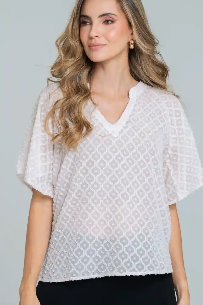Blusa en tejido plano con efecto especial, cuello y escote en V, sisa en diagonal, manga corta, aberturas de 6cms a lado y lado del ruedo, ruedo de 0.8mm, silueta semi ajustada.