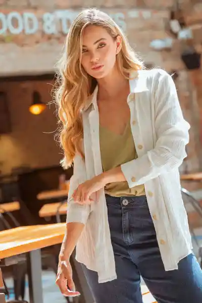 En Tejido Plano Texturado de Cuello y Perilla Completa de Botones 24L Manga Larga Con Puño y Botón de 24L Espalda Lisa Silueta Semi Ajustada.