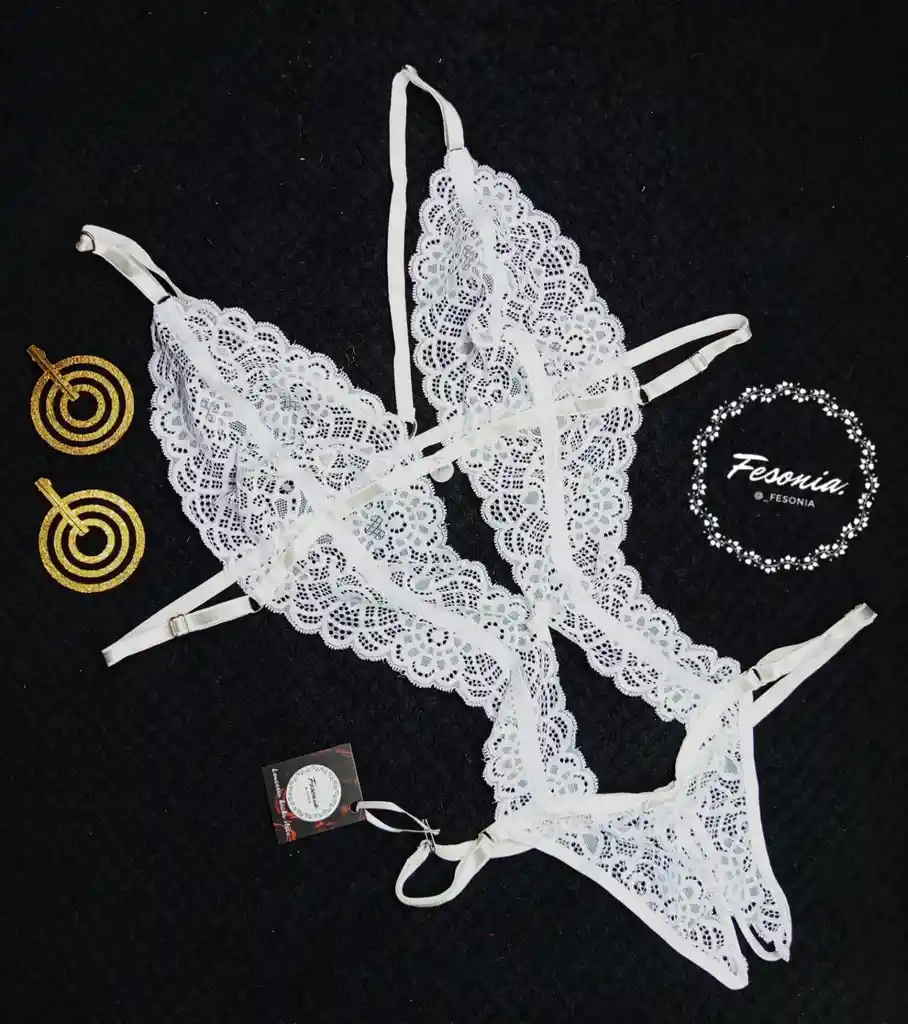 BODY EROTICO COLOR BLANCO, EN ENCAJE CON DETALLE METALICO EN FORMA DE CORAZON, CON AVERTURA EN LA PANTY, TALLA UNICA AJUSTABLE