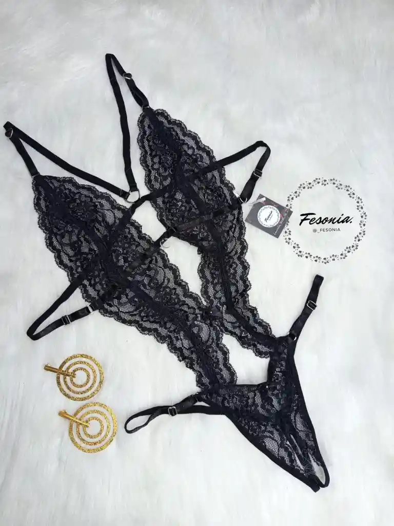 BODY EROTICO COLOR NEGRO, EN ENCAJE CON DETALLE METALICO EN FORMA DE CORAZON, CON AVERTURA EN LA PANTY, TALLA UNICA AJUSTABLE