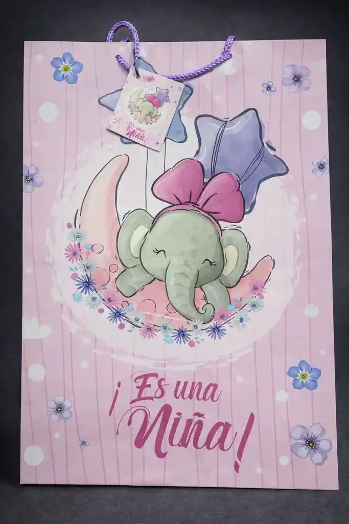 Bolsa de regalo – baby shower Hermosa bolsa de regalo temática para bebé niña, ideal para celebrar nacimientos, baby showers o visitas al hospital. 🎀 Características: Diseño infantil en tonos pastel rosados, delicados y tiernos. Ilustración central de elefantita con moño, luna, flores y estrellas, que transmite dulzura y ternura. Frase decorativa “¡Es una Niña!” en tipografía elegante y llamativa. Material resistente y de excelente calidad, con acabado brillante. Asas de cordón en color morado, firmes y cómodas para cargar. Incluye tarjeta colgante a juego para dedicatoria. 🎁 Ideal para: Regalos de recién nacida Baby shower Revelación de género Detalles especiales para mamá y bebé