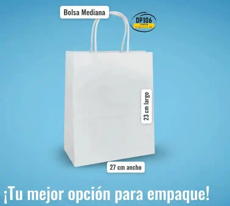 1 bolsa de 23 cm largo x 27 cm de ancho , papel kraft blanco ,con manija