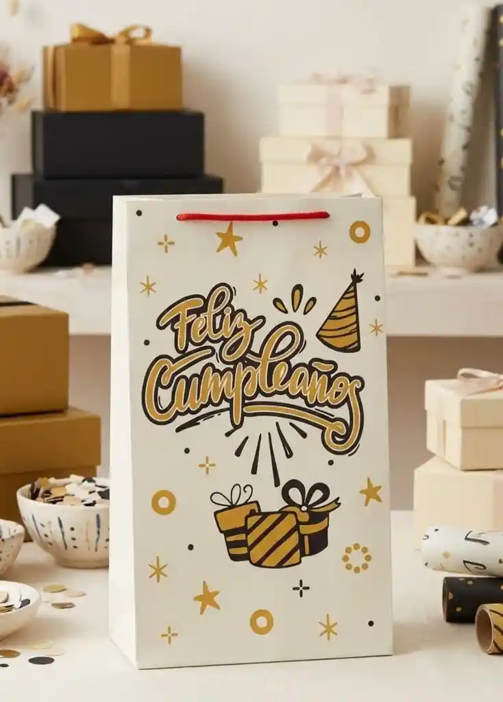 🎉 Bolsa de Regalo – Cartulina Naranja (27 x 16 cm) | “Feliz cumpleaños” 🧡