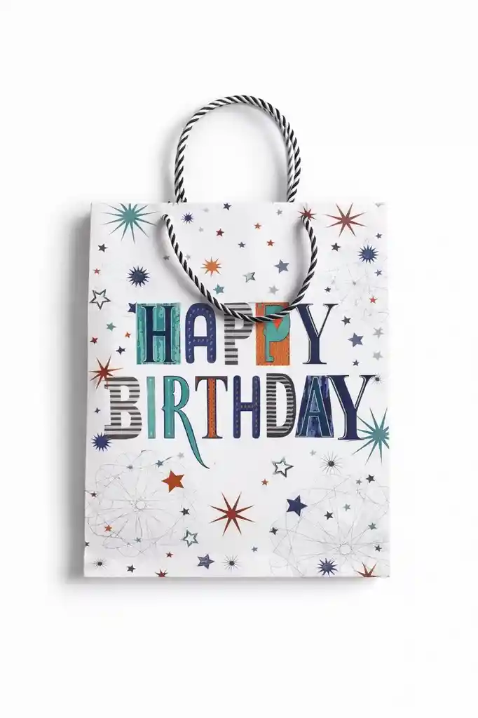 Bolsa de regalo de papel con letras escarchadas. Tamaño grande 26cm x 32cm, diseño Happy birthday colores azul y naranja