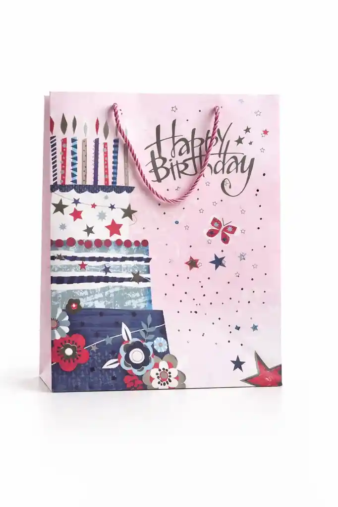 Bolsa de regalo de papel con letras escarchadas. Tamaño grande 26cm x 32cm, diseño Happy birthday colores rosados