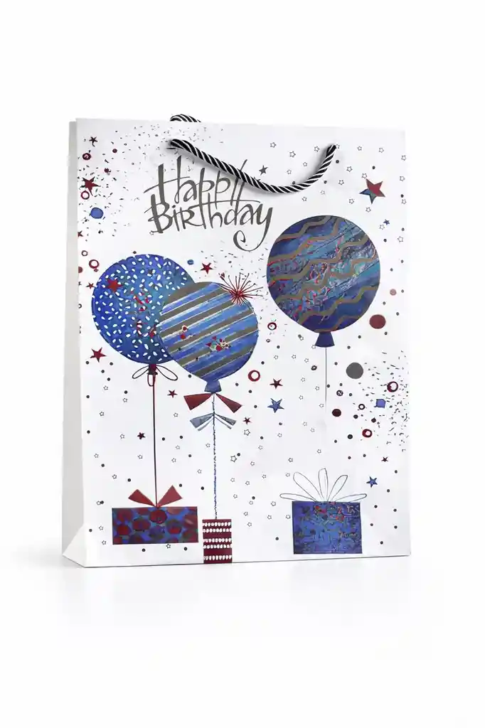 Bolsa de regalo de papel con letras escarchadas. Tamaño grande 26cm x 32cm, diseño Happy birthday colores azules con globos