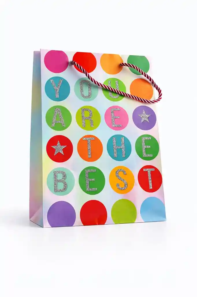 Bolsa de regalo de papel con letras escarchadas. Tamaño mediana 18cm x 24cm, diseño "You are the best" colores variados