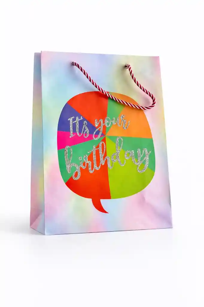 Bolsa de regalo de papel con letras escarchadas. Tamaño mediana 18cm x 24cm, diseño "It's your birthday" colores variados