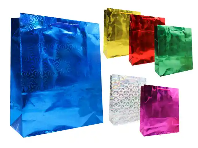 Bolsa de papel regalo brillante, en colores azul, verde, dorado, plateado, rojo, rosado. Medidas de alto 45cms, ancho 33cms y fuelle de 10cms.
