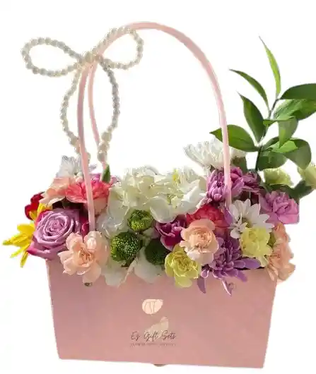 Arreglo en bolsa rosa con asas de perlas, compuesto por rosas en tonos pastel, claveles, margaritas/crisantemos blancos y botón verde, lisianthus y toques de follaje fresco (según disponibilidad). Detalle tierno y elegante ideal para cumpleaños, baby shower o agradecimientos. Presentación premium e incluye tarjeta dedicatoria. Entrega rápida el mismo día.