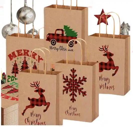 BOLSAS NAVIDEÑAS PAQUETE X 12 SURTIDAS PAPEL KRAFT DISEÑOS UNICOS. MEDIDAS: 21X15X8