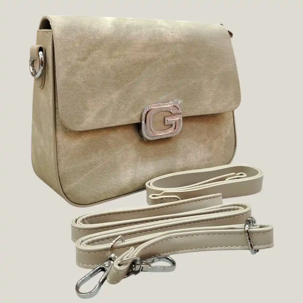 Dale un toque de elegancia a tu look con este bolso en tono beige champagne, diseñado para destacar en cualquier ocasión. Su acabado suave y sofisticado, junto con el detalle metálico frontal en forma de “G”, le aporta un estilo moderno y chic. Incluye correas ajustables para que lo uses a tu manera: al hombro o cruzado. ¡Un accesorio versátil, elegante y perfecto para elevar cualquier outfit con un brillo sutil y de buen gusto!