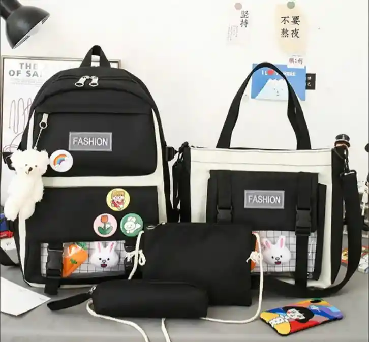 🎒✨ SET COMPLETO DE BOLSOS ESCOLARES – DISEÑO TIERNO, PRÁCTICO Y FUNCIONAL Lleva todo con estilo y organización gracias a este set completo de bolsos, elaborado con materiales de alta calidad y un diseño seguro, práctico y adorable, perfecto para estudiantes, viajes o uso diario. Incluye hermosos accesorios decorativos que permiten personalizar cada pieza y darle un toque único y encantador. 💖 DISEÑO ÚNICO Y PERSONALIZABLE Este set cuenta con: 🧸 Oso en felpa decorativo 🐰 4 peluches (2 conejos + 2 zanahorias) 📌 1 pin decorativo Perfecto para personalizar tu mochila y destacar tu estilo. 📦 SET DE 5 PIEZAS PARA UNA ORGANIZACIÓN TOTAL Incluye: 1️⃣ Mochila escolar / bolso grande 2️⃣ Bolso mediano / de hombro 3️⃣ Cartuchera 4️⃣ Cosmetiquera 5️⃣ Bolsita pequeña para accesorios Ideal para mantener libros, útiles, maquillaje y objetos personales siempre ordenados. 📏 MEDIDAS APROXIMADAS Mochila escolar grande: 30 × 12 × 42 cm (apta para portátil de hasta 14”) Bolso de hombro: 29 × 14 × 32 cm (capacidad para varios libros) Bolsita pequeña: 20 × 15 cm Cartuchera: 20 × 5 cm Bolso grande adicional: 42 × 28 × 13 cm (Las medidas pueden variar ligeramente según el método de medición) 🧵 MATERIALES DE CALIDAD Material principal: Lona y tela Oxford Resistente, liviano y fácil de limpiar Peso aproximado del set: 0,45 kg 🎨 COLORES DISPONIBLES Morado Negro Azul Rosa 📌 El color predeterminado es el de la imagen principal. Puedes dejar una nota si deseas cambiarlo. 🌟 IDEAL PARA ✔ Uso escolar ✔ Universidad ✔ Viajes ✔ Regalo perfecto ✔ Uso diario con estilo