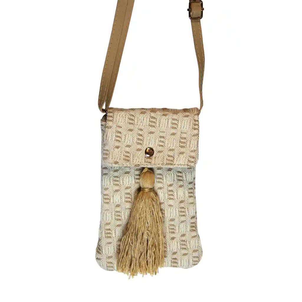 El Bolso Porta Celular "Etnia" es la pieza ideal para quienes buscan un accesorio ligero con un toque de diseño tradicional. Su cuerpo de tejido tramado en tonos crema y mostaza ofrece una estética cálida y orgánica, convirtiéndolo en el complemento perfecto para un estilo de vida práctico y relajado.