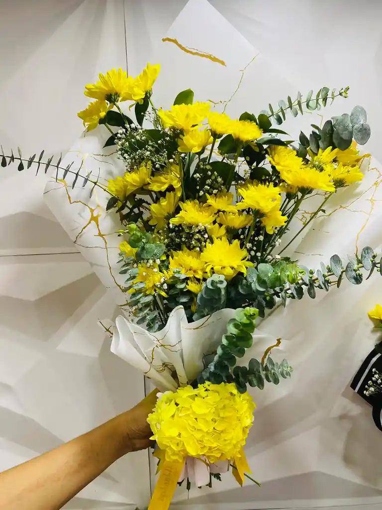 booquet en papel coreano con pompom eucalipto toque de hortencia