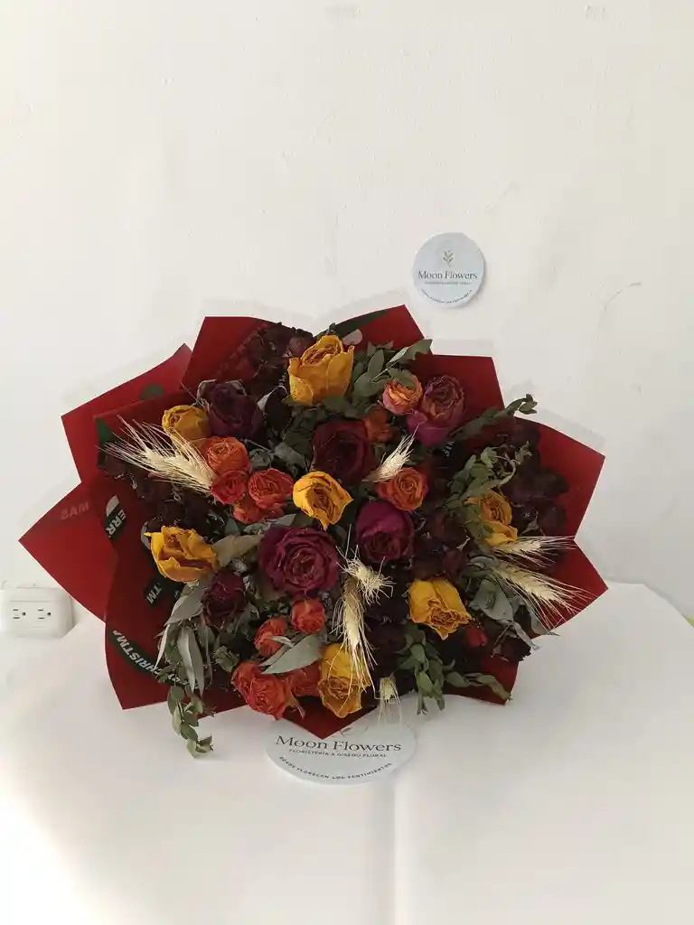Buquet de rosas secas color rojo, amarillo y naranja acompañado de eucalipto y espigas