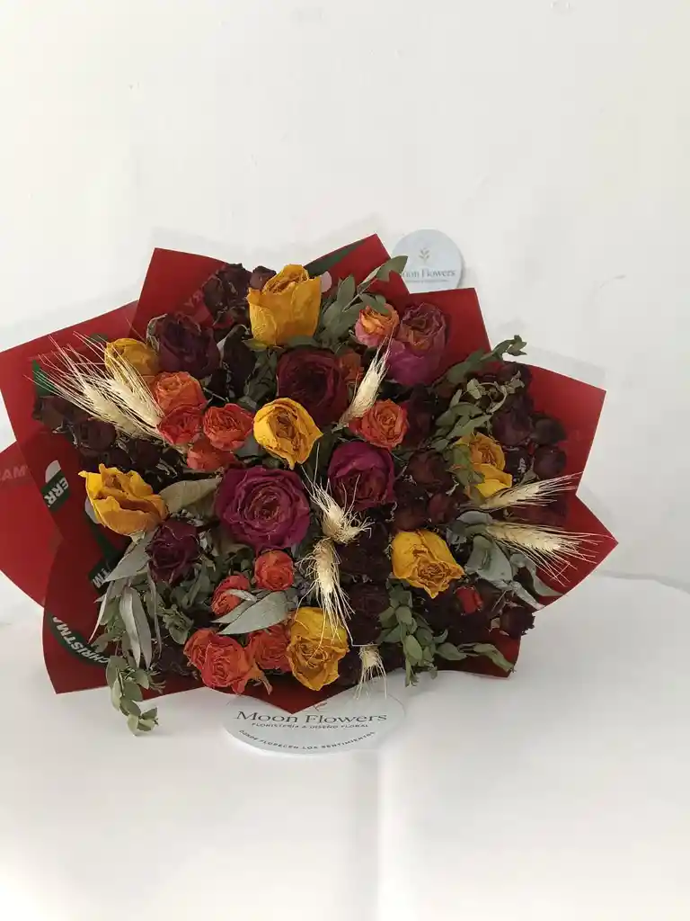 Buquet de rosas secas color rojo, amarillo y naranja acompañado de eucalipto y espigas