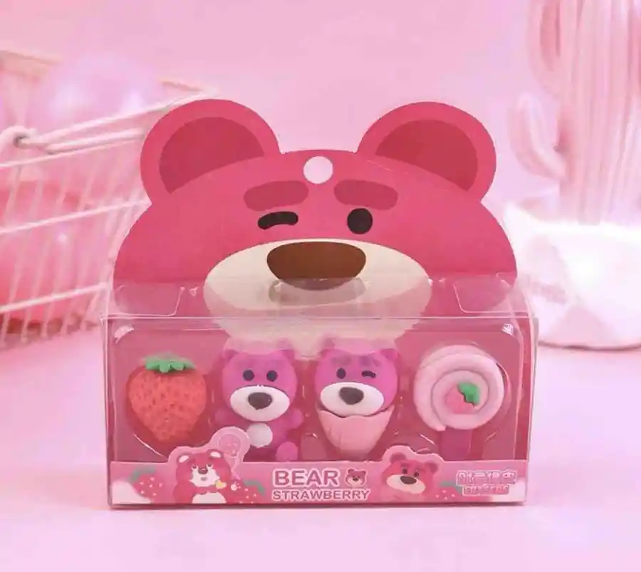 divertido set de borradores del muñeco Lotso para darle un toque divertido al estudio de nuestros hijos.