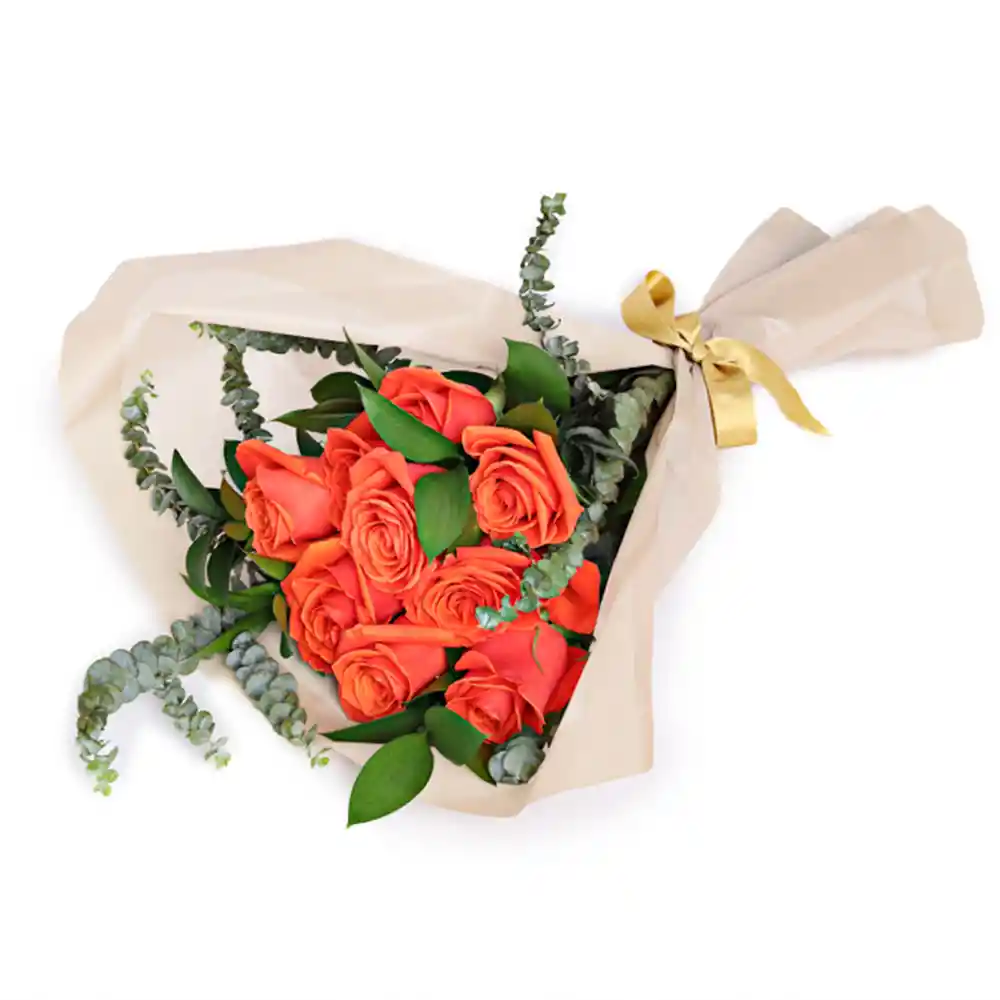 Bouquet De 9 Rosas Amarillas / Naranja Y Follaje. La Foto Es Referencial, El Color Puede Variar Amarillo/ Naranja/ Bicolor.