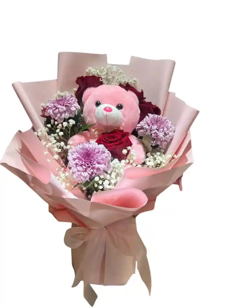 Un tierno bouquet que combina flores frescas con un adorable peluche, ideal para sorprender a alguien especial con un detalle lleno de amor y dulzura. Nota: La flor puede ser sustituida dependiendo de la disponibilidad de color y del producto. "Mensaje Personalizado" máximo de 30 caracteres (Dejar el mensaje en el chat, los comentarios no se previsualizan para la tienda, por lo que si se dejan allí no podrá ser incluido).