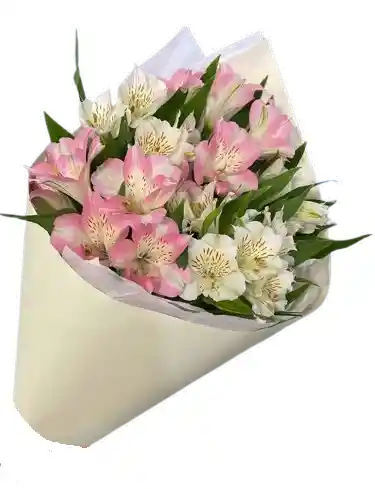 Un bouquet suave y elegante conformado por alstroemerias en tonos rosa pastel y blanco, acompañadas de follaje verde que aporta frescura y movimiento. Su envoltura blanca minimalista resalta la belleza natural de las flores y otorga un acabado limpio y moderno. Perfecto para regalar en cumpleaños, agradecimientos, momentos especiales o simplemente para iluminar el día de alguien con un detalle delicado y lleno de ternura. Las alstroemerias, símbolo de amistad y cariño sincero, hacen de este bouquet una elección encantadora y significativa.