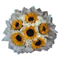 Bouquet de 6 girasoles y 24 rosas blancas Nota: La flor puede ser sustituida dependiendo la disponibilidad de color y del producto “Mensaje Personalizado” máximo de 30 caracteres (Dejar el mensaje en el chat, los comentarios no se previsualizan para la tienda por lo que si se dejan allí no podrá ser incluido).