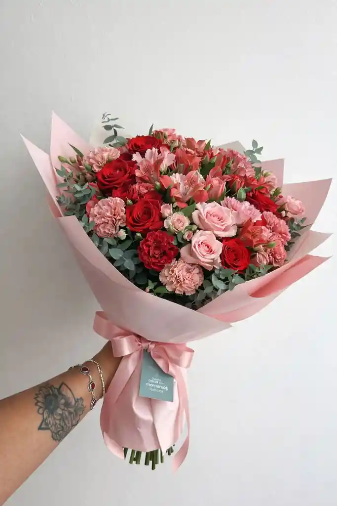 Ramo artesanal en tonos vino y verde. Composicion equilibrada, textura suave y acabado premium. Ideal para regalo o decoracion.