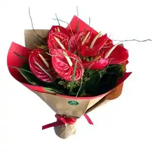 Bouquet de 8 anturios con 5 varas de follaje. La flor puede ser sustituida dependiendo la disponibilidad de color y del producto “Mensaje Personalizado” máximo de 30 caracteres (Dejar el mensaje en el chat, los comentarios no se previsualizan para la tienda por lo que si se dejan allí no podrá ser incluido)