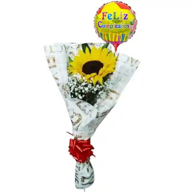 Bouquet de 1 girasol con papel y moño y globo de 9 pulgadas metalizado de feliz cumpleaños, diseño sujeto a disponibilidad del día