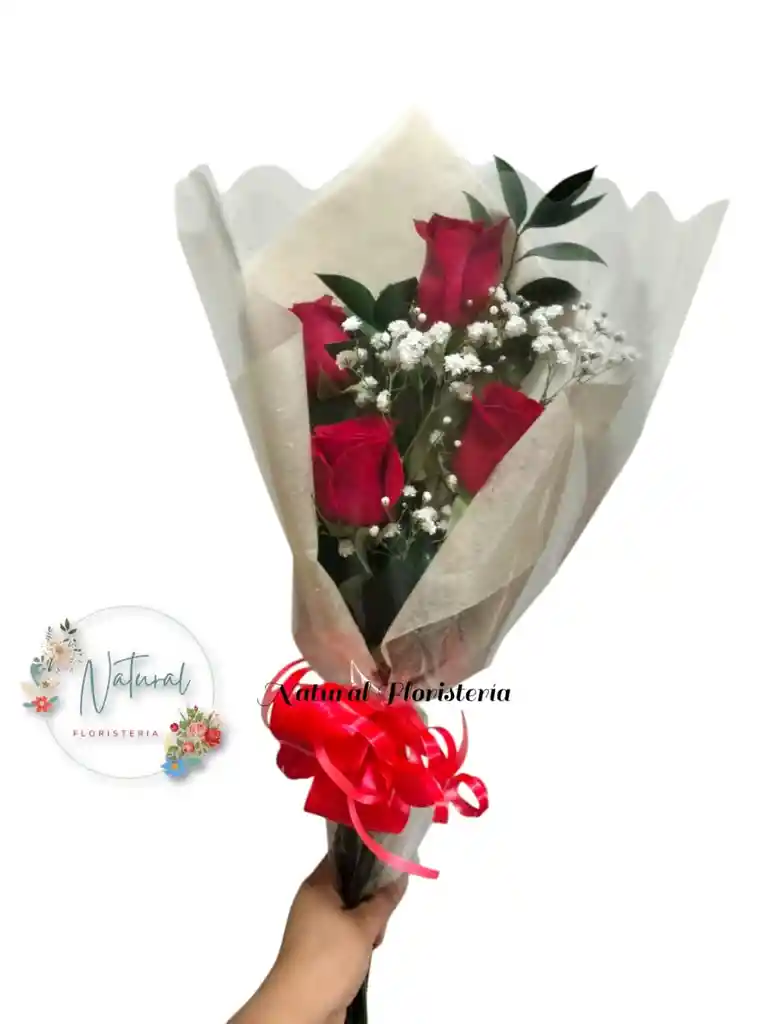 Bouquet de 4 rosas rojas con follajes.