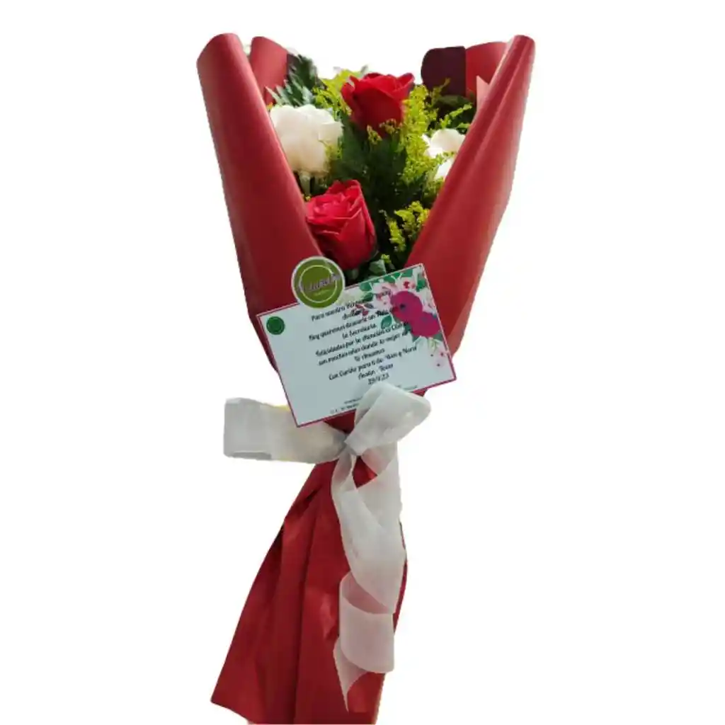 Bouquet de 4 rosas rojas y blancas con follaje variado, papel y moño
