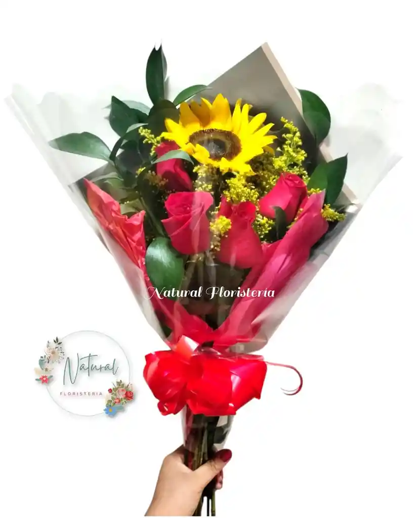 Bouquet de 4 rosas y un girasol. SI DESEA ALGUNA NOTA PARA LAS FLORES DEJARLO EN DEJAR UN COMENTARIO EN AL SHOPPER, MENSAJE CORTO (TARJETA PEQUEÑA). FOTO DE REFERENCIA.