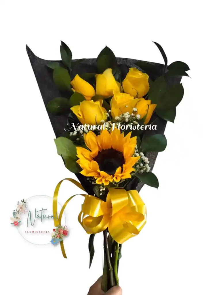 Bouquet de 6 rosas amarillas un girasol. SI DESEA ALGUNA NOTA PARA LAS FLORES DEJARLO EN DEJAR UN COMENTARIO EN AL SHOPPER, MENSAJE CORTO (TARJETA PEQUEÑA). FOTO DE REFERENCIA.