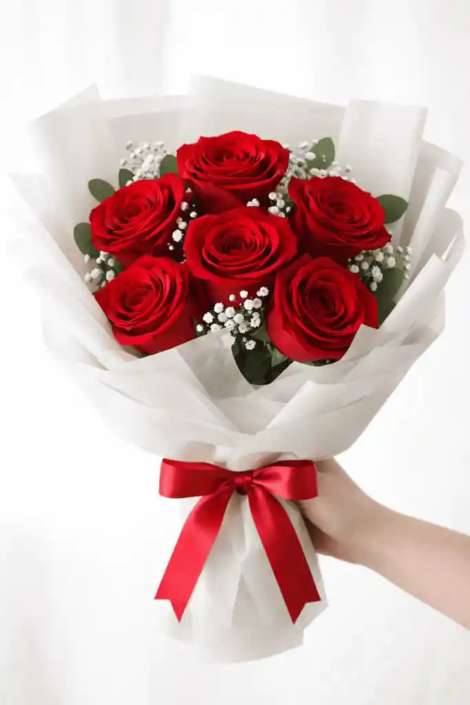 Sorprende con la elegancia y el romance de este hermoso bouquet de 6 rosas rojas naturales, cuidadosamente seleccionadas por su frescura y belleza. Cada ramo está decorado con delicados detalles de follaje y envuelto en sofisticado papel coreano que realza su presentación, acompañado de un fino moño decorativo. Perfecto para expresar amor, admiración o hacer de cualquier momento una ocasión especial. ✨ Incluye: 6 rosas rojas naturales Follaje decorativo y flores complementarias Envoltura en papel coreano elegante Moño decorativo 📌 Nota: El tono del papel y accesorios puede variar según disponibilidad, manteniendo siempre un acabado hermoso y armonioso.