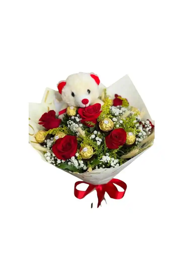 Bouquet de 7 rosas rojas con follaje, peluche peqeño 10 cm y chocolates ferrero x 4. Si desea mensaje dejarlo en donde dice dejar un comentario en el shopper.