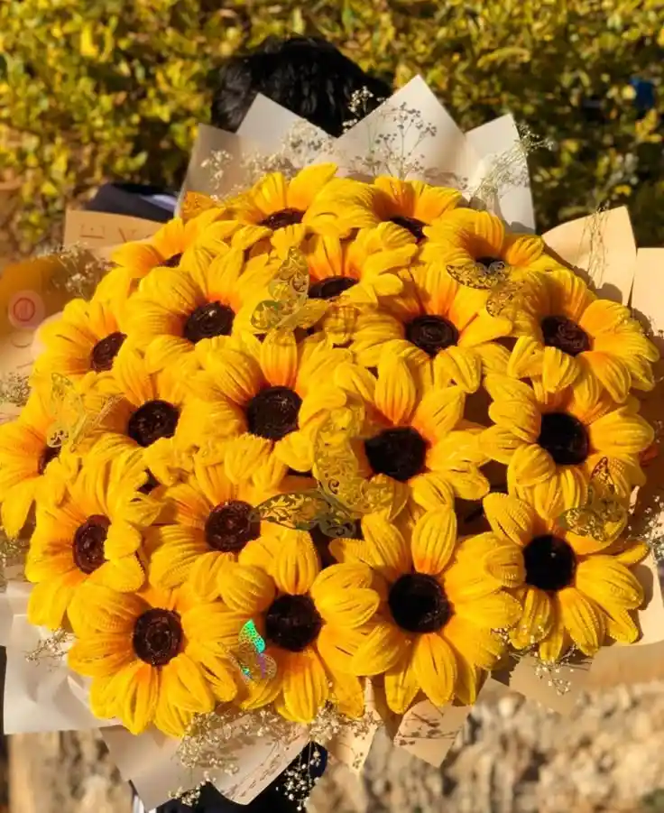 Bouquet de 8-12 girasoles aproximadamente. La flor puede ser sustituida dependiendo la disponibilidad de color y del producto “Mensaje Personalizado” máximo de 30 caracteres (Dejar el mensaje en el chat, los comentarios no se previsualizan para la tienda por lo que si se dejan allí no podrá ser incluido).