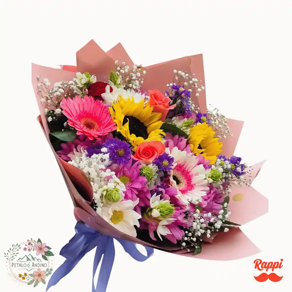Bouquet vibrante y lleno de vida que combina girasoles, gerberas, rosas y flores surtidas en tonos rosados, morados y blancos, acompañado de delicadas gipsófilas y follaje natural. Envuelto en elegante papel coreano y decorado con lazo, es un detalle perfecto para celebrar cumpleaños, alegrar el día de alguien especial o sorprender con un regalo lleno de color y emoción. Entregas en Bogotá.